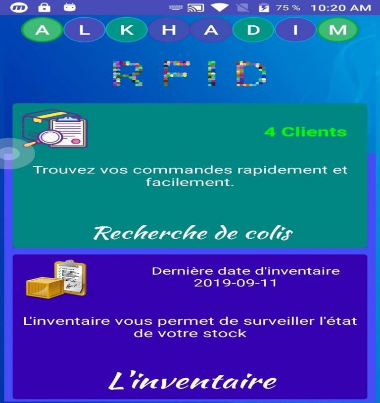 ALKHADIM RFID  is a  mobile  application running on the  Android system . It aims to facilitate  stock management , using the  PDA , while being based on modern technology called  RFID  using a  UHF reader .